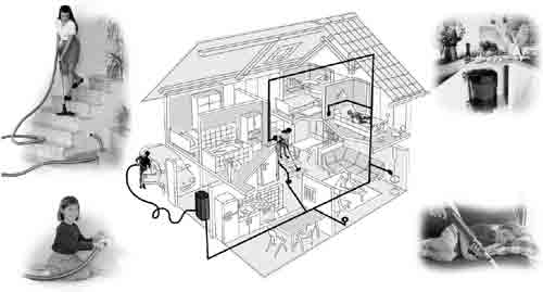 Промышленный агрегат-пылесос размещают в подвале здания. Бытовой — в гараже коттеджа, кладовке или на кухне под мойкой. От него в каждое помещение проводится скрытая в полу или стенах разводка. Закладка труб производится во время ремонта или строительства. Трубопроводы оканчиваются специальными розетками для подключения гибкого шланга. Для уборки шланг подсоединяется к розетке. Агрегат запускается с помощью кнопки, расположенной на рукояти шланга, либо автоматически в момент подключения шланга к пневморозетке. После включения агрегата пыль с мусором засасывается в фильтр. Отфильтрованный воздух удаляется за пределы здания. В помещениях, где нужно часто убирать (прихожие, кухни), можно дополнительно установить пристенный (плинтусный) совок. Мусор просто подметают к нему и ногой нажимают на клавишу включения.